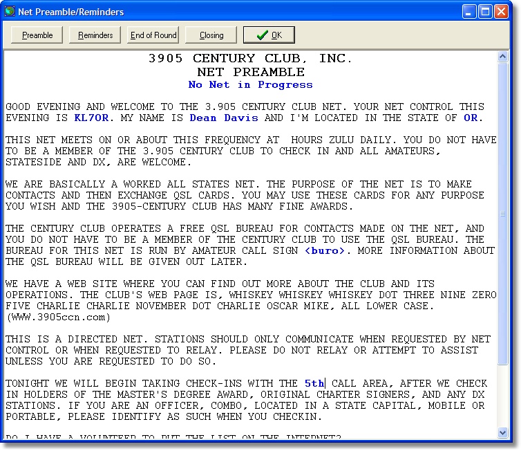 records and print QSL cards for contacts made on the 3905 nets. This saves